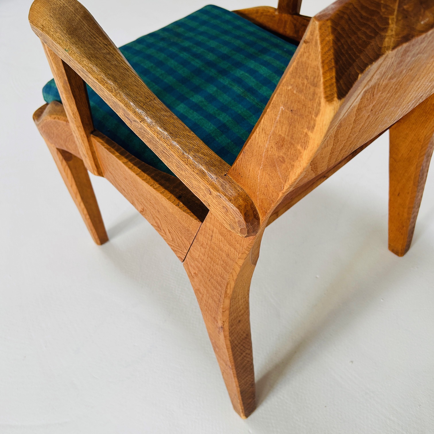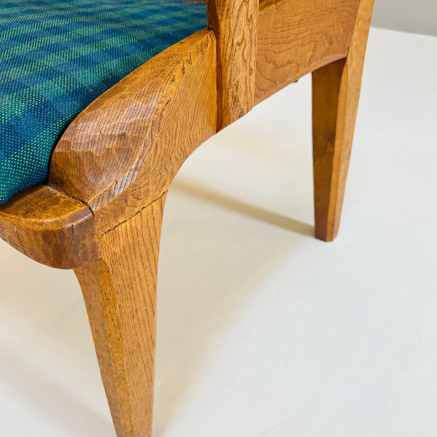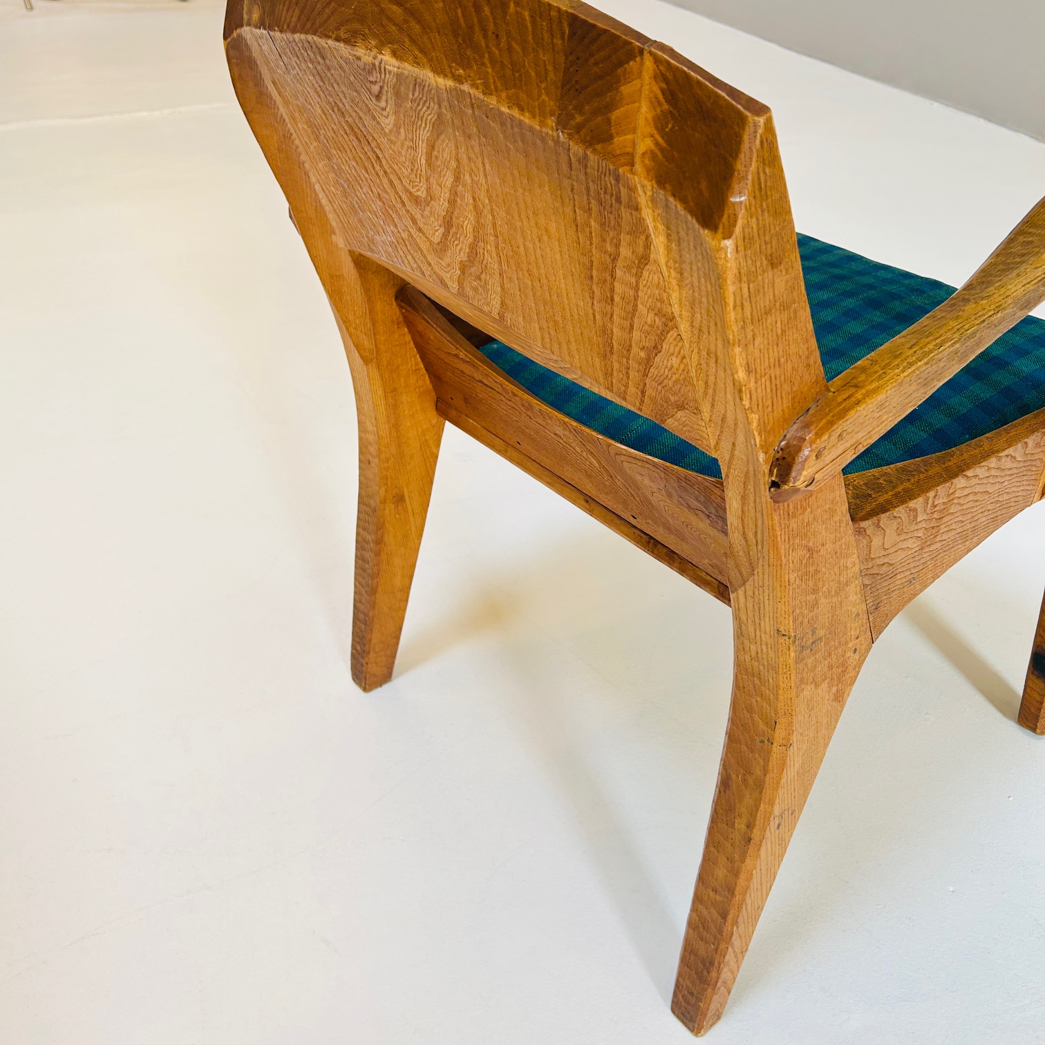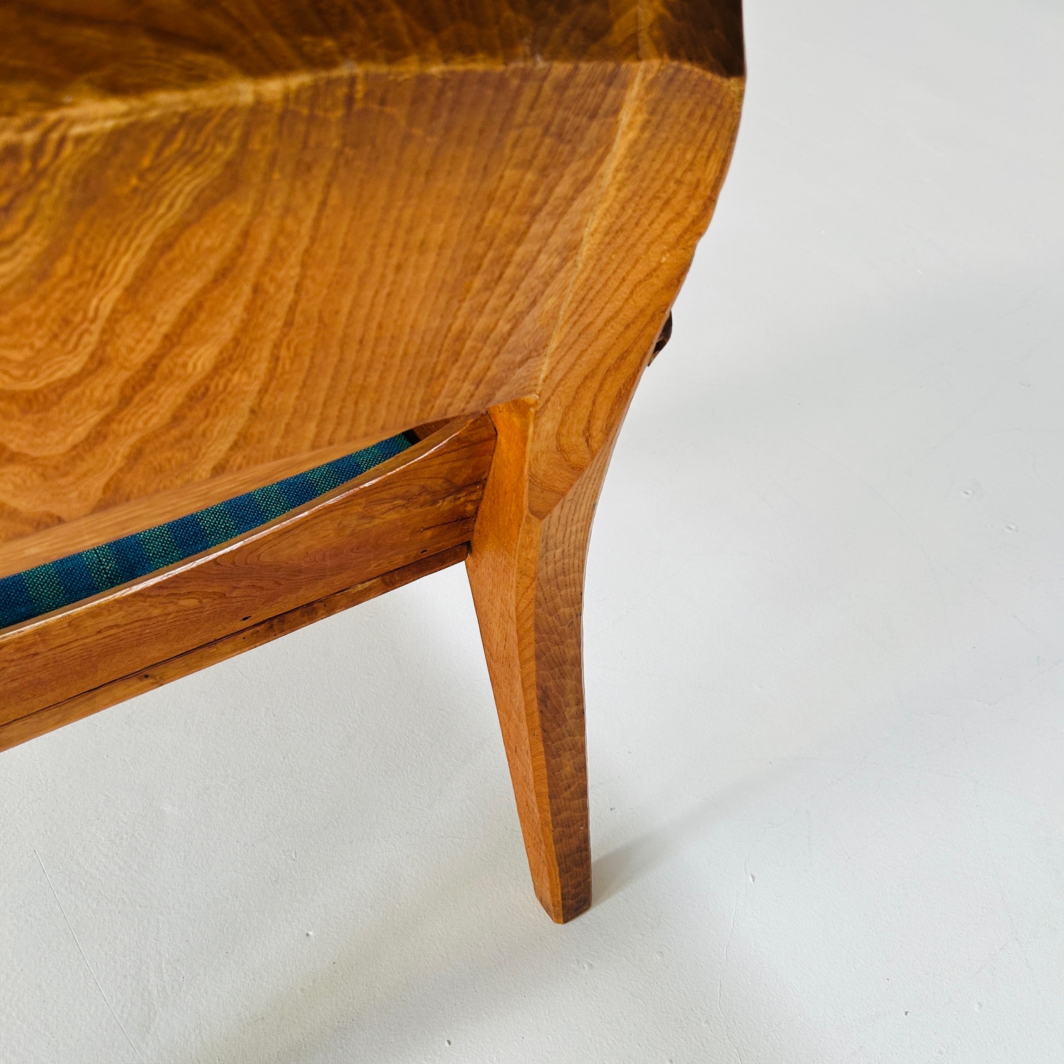 Der Sessel ist aus Eschenholz gefertigt, einem Material, das häufig im Kontext anthroposophisch geprägter Möbelgestaltung verwendet wurde. Die Oberfläche zeigt deutlich die Spuren traditioneller Holzbearbeitung mit Hobel und Dechsel. Diese Bearbeitung verleiht dem Möbel eine lebendige, plastische Struktur. Das Holz ist lediglich geölt.