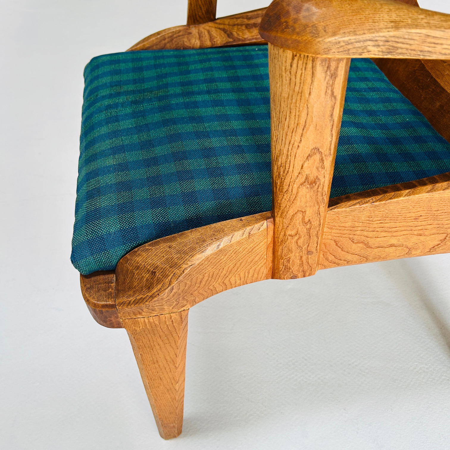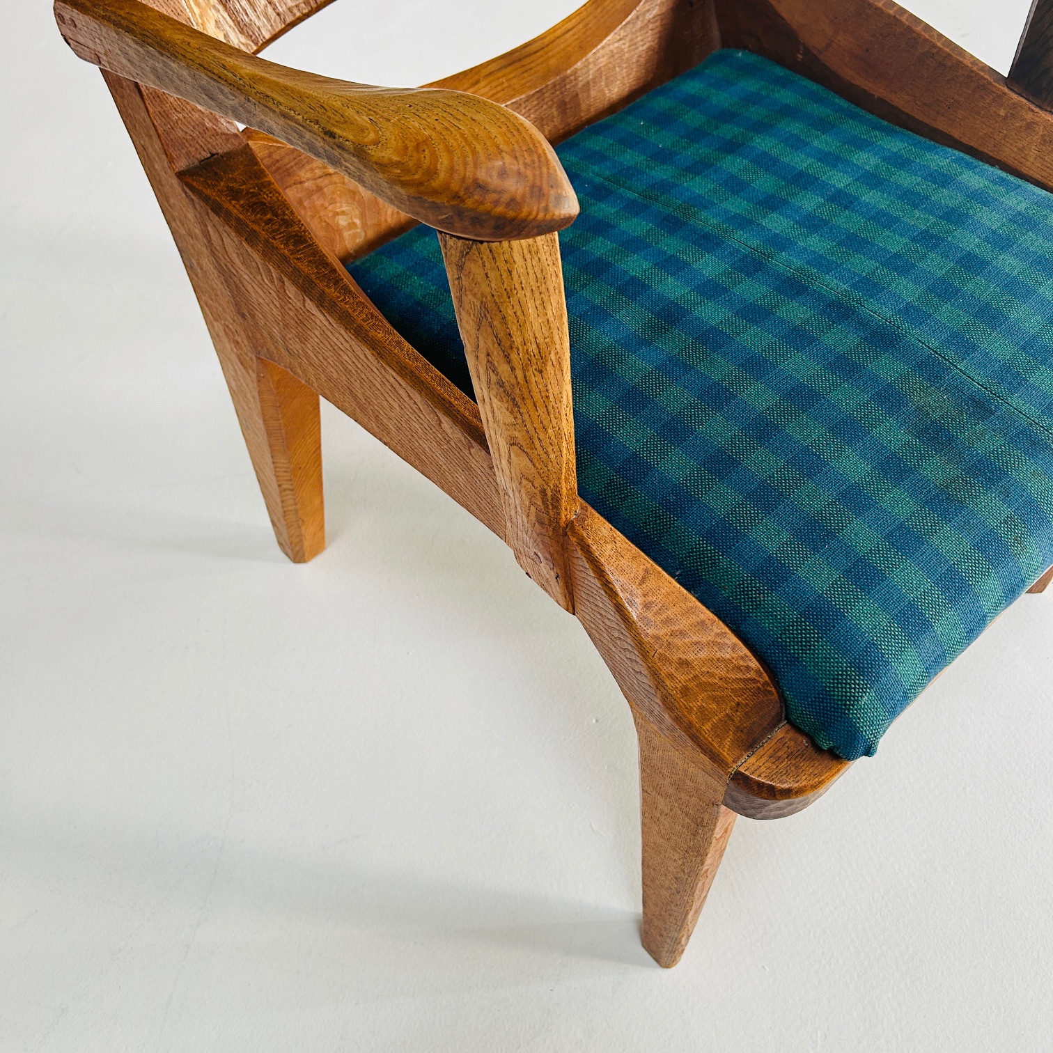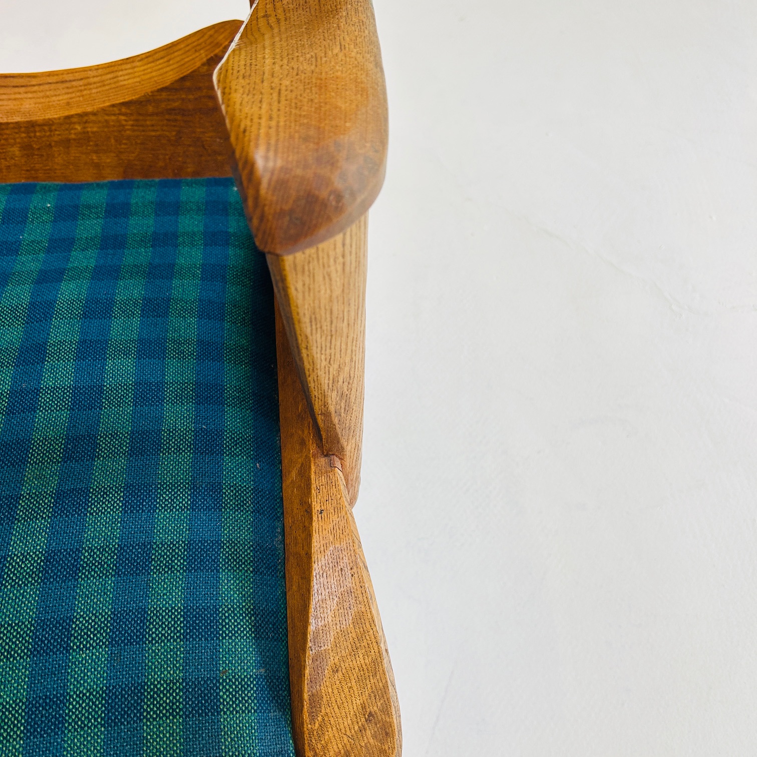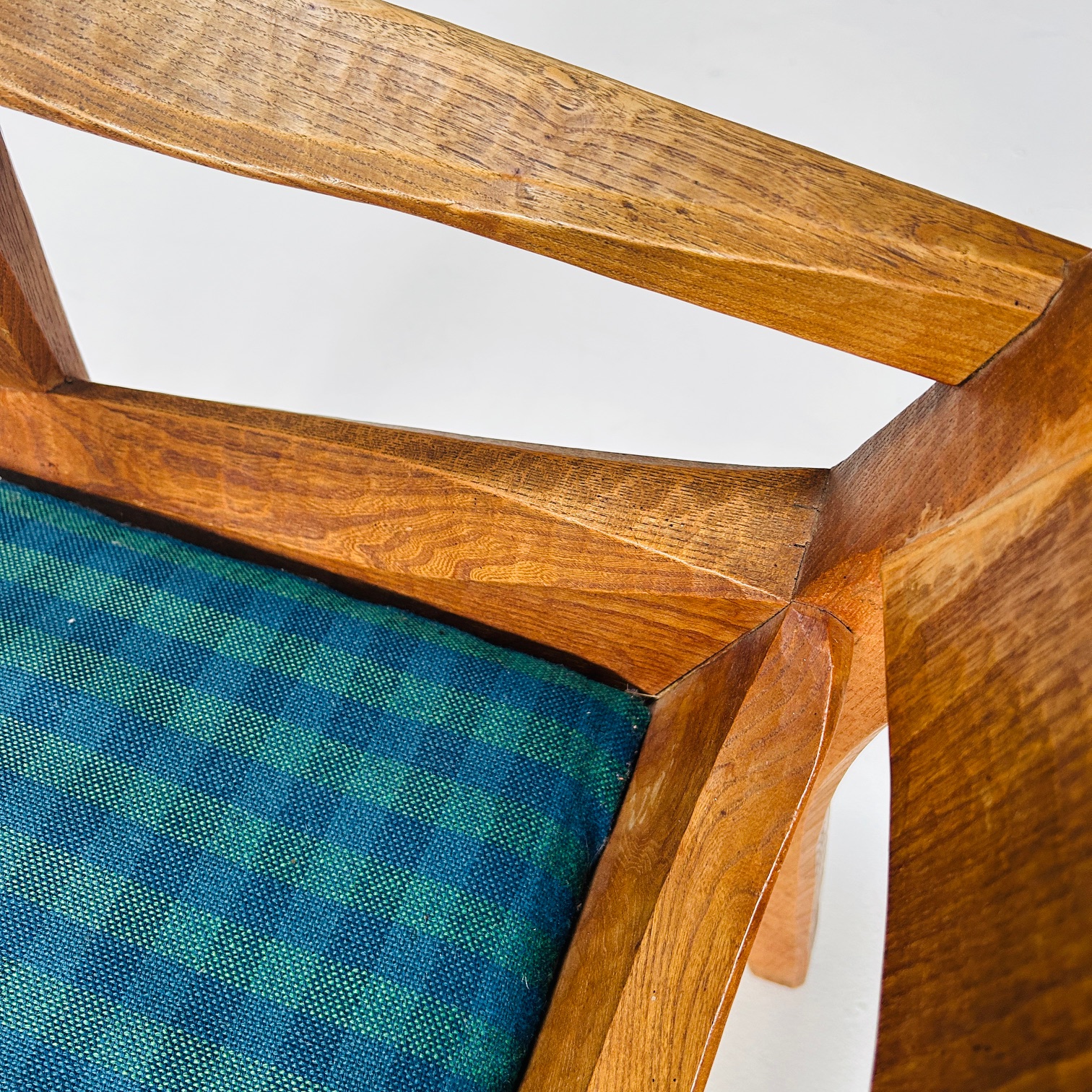 Der Sessel ist aus Eschenholz gefertigt, einem Material, das häufig im Kontext anthroposophisch geprägter Möbelgestaltung verwendet wurde. Die Oberfläche zeigt deutlich die Spuren traditioneller Holzbearbeitung mit Hobel und Dechsel. Diese Bearbeitung verleiht dem Möbel eine lebendige, plastische Struktur. Das Holz ist lediglich geölt.